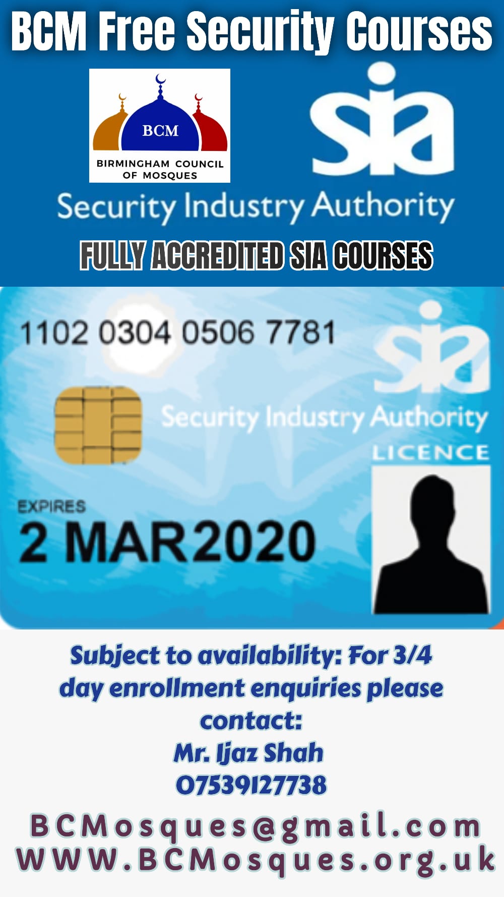 FREE SIA security training and certification on passing, exclusively for Masajids, organised by BCM. First come, first served so please contact Br Ijaz Shah to register to register your FREE place, JazakAllah khayr.